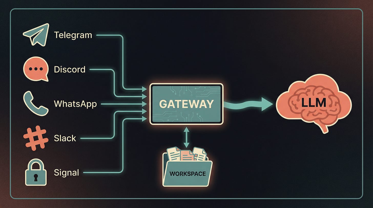 Gateway: El daemon central—piensa en él como el director de orquesta. Corre 24/7, mantiene conexiones con todos los canales, y decide cuándo y cómo procesar cada mensaje.