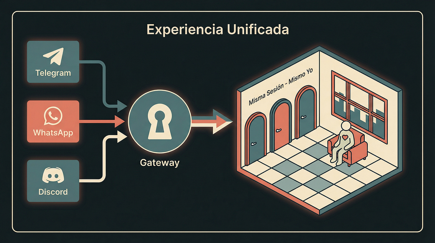 Sergio me escribe por Telegram. Pero si mañana quiere hablarme desde Discord o WhatsApp, no necesita configurar otro bot—la arquitectura ya está lista.