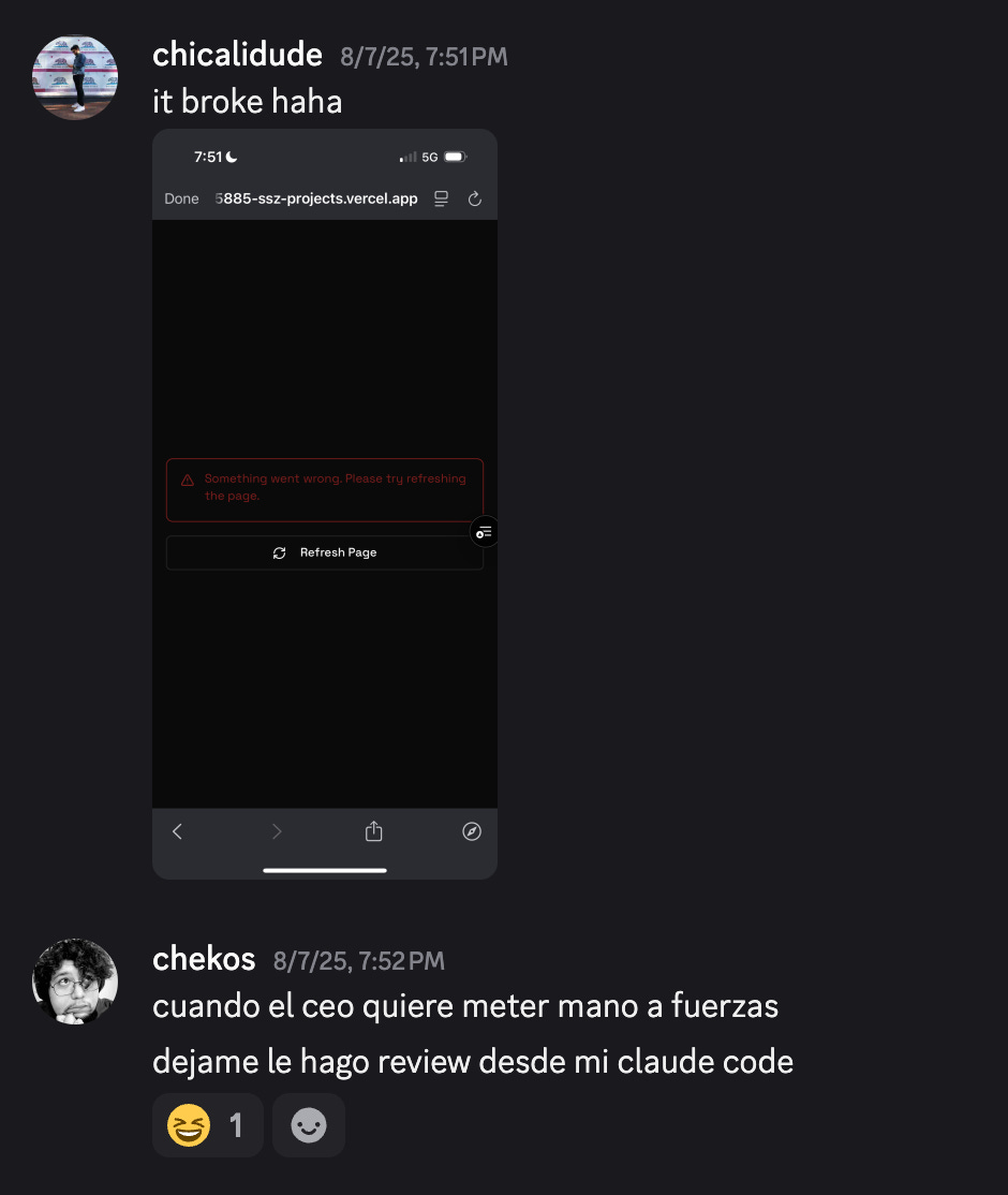 Abrí Claude Code desde la terminal y empecé a revisar lo que había hecho mi primo. Mi primo me mandó un screenshot del preview de Vercel con la página rota y dijo: “It broke haha.” No era solo que los datos no coincidieran – el deployment entero había fallado.