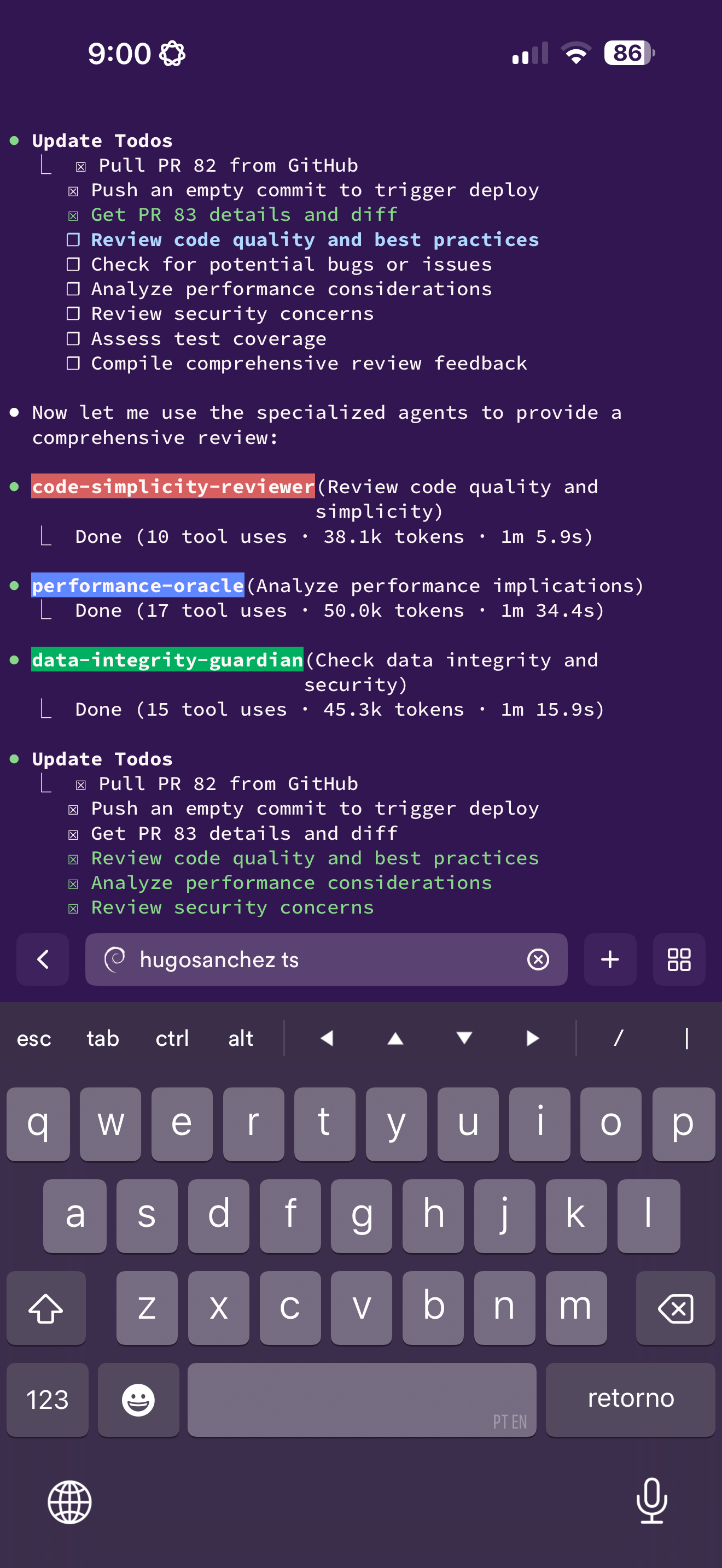 “Déjame le hago review desde mi Claude Code.” Abrí Termius, me conecté a hugosanchez