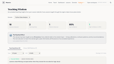 Pero esta vez no se diluyó. Pasó algo mejor: cada dominio nuevo fortalecía a los demás. Evaluar mejoraba las lecciones. Mejores lecciones producían mejores materiales. Y cada cosa nueva mejoraba el trabajo de las demás.